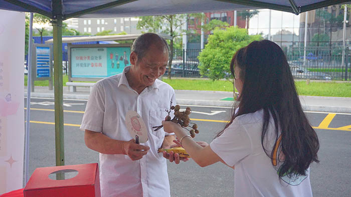 晶瑩的龍眼、香甜的芒果、飽滿的香蕉,在助農產品攤上擺放著各式各樣水果,每一位前來觀看科普宣講的居民都可以免費得到。攤位上的水果均是實踐隊成員向惠州當地果農收購,目的是讓居民品嘗到品質優良的水果,“食過返尋味”,向果農購買,以此達到助農扶農的目的。隊員們在現場拿著水果在攤位上向居民們展示,詳細地介紹了水果的產地和風味,同時為了宣傳本隊伍與學校,鼓勵居民積極參與,隊員們在準備美味的水果外還準備了豐富實用的隊伍文創,如印有隊伍logo“柚子”的扇子與口罩。在居民們在鄉村振興問答屋中回答問題后免費發放,給他們帶來知識的同時還有清涼與便利。前來攤位的小朋友們還在現場品嘗了龍眼,他們還積極地為助農產品攤做宣傳,“我回去喊我朋友也來參加!”
