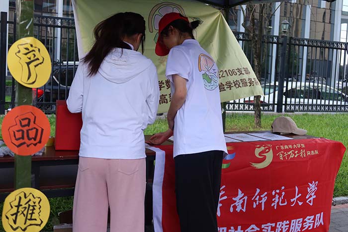 “阿叔阿姨過來看看呀!這里有鄉村振興的知識科普!”在科普亭中,隊員們身穿白色隊服,熱情地招呼著過路的居民們前來攤位學習鄉村振興相關知識。隊伍精心制作的易拉寶上生動而全面地展示了鄉村振興相關知識。從五大核心到“三步走”戰略,隊員們入鄉隨俗,用通俗易懂、生動有趣的惠州話將鄉村振興的內涵意義娓娓道來。“鄉村振興就是為了讓農民種的糧食賣得出去,讓農村的生活變得更好。”面對不同身份、不同年齡的居民,隊員們采取了不同的介紹方式,帶領居民們了解鄉村振興相關舉措已經其重要性外,讓他們切身感受鄉村振興的好處。為小朋友們講解時,隊員還指著易拉寶上“鄉村振興”的字樣教他們識字。散步的老人、放學的孩子、下班的工人紛紛被隊伍的宣講吸引,駐足攤位前學習鄉村振興知識。