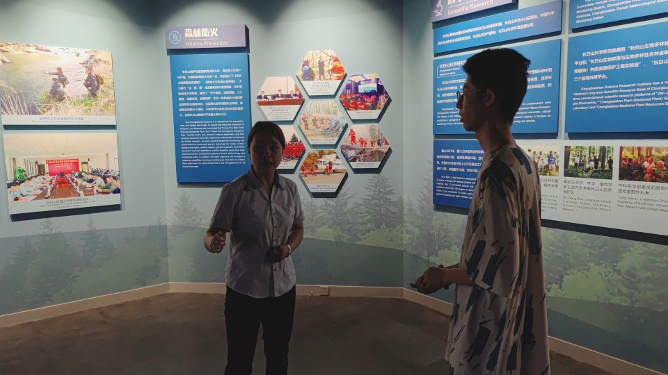 長白山自然博物館位于長白山北坡腳下,館內設有豐富多樣的展覽廳和陳列館,陳列著大量的自然歷史標本和文化遺物,介紹了長白山地區的地貌、動植物、生物多樣性保護等方面的內容。7月10日,實踐團隊來到長白山自然博物館,更加全面地了解長白山地區的生態環境和自然風貌。又參觀了博物館工作人員為前來研學的小朋友們進行講解的過程,并且向工作人員了解了她們平時的講解工作,用專業知識與工作人員交流了講解長白山地質情況的方法,為以后成員們的宣講工作做準備。