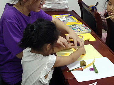 圖為團(tuán)隊(duì)成員幫助小朋友制作樹葉貼畫。中國計(jì)量大學(xué)嚴(yán)淑寒?dāng)z。