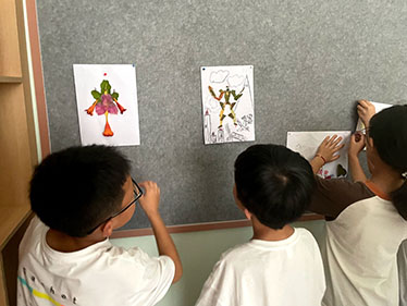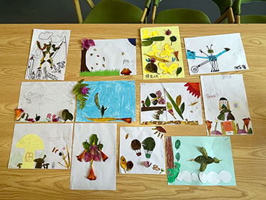 圖為小朋友粘貼展示樹葉貼畫。中國計(jì)量大學(xué)李羿佳攝。