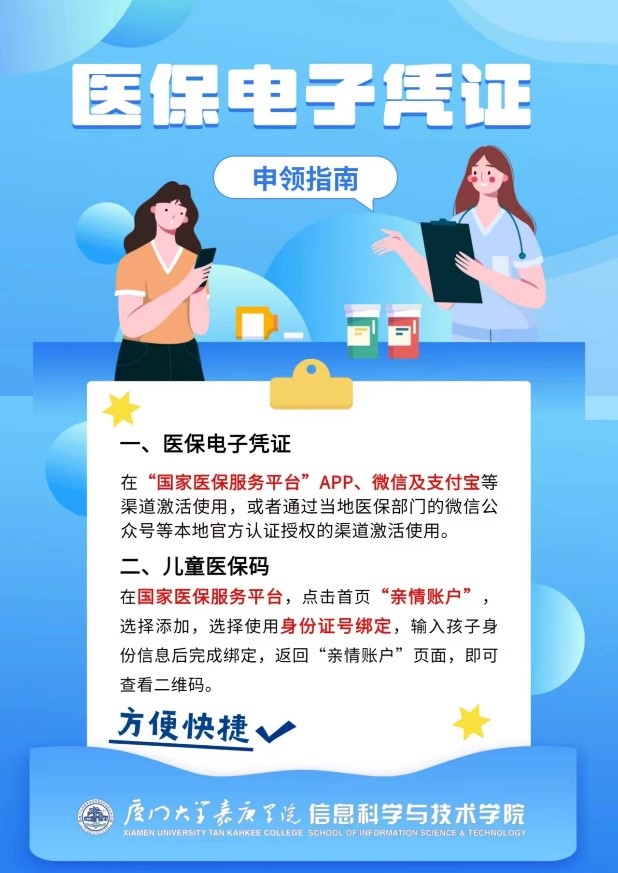 隨著時代的發展,電子醫保憑證依據其方便快捷、應用豐富、全國可用、安全可靠的優點,正在逐漸代替實體醫保卡。激活電子醫保憑證,便利就醫,是國家惠民利民的好政策,實行并推廣這項政策是每個中國公民的責任。為加快推進“互聯網+醫保”線上業務發展,提高廣大人民群眾對電子醫保的知曉率和使用率,2023年6月29日至7月2日,廈門大學嘉庚學院信息科學與技術學院“醫保寶”實踐隊走進廈門市兒童醫院,聯合廈門市兒童醫院醫保辦開展志愿服務活動。本次活動通過座談交流、自制宣傳單、引導服務等實踐方式,幫助不了解電子醫保的家長們激活電子醫保,申請兒童醫保碼,為他們講解電子醫保的好處,更好地享受科技的發展和國家的惠利。