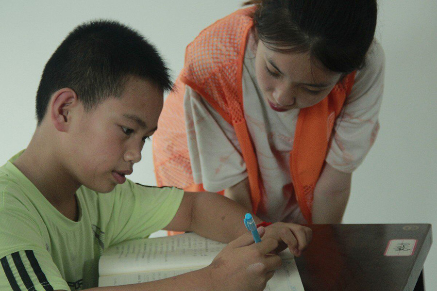 圖為隊(duì)員正在給小朋友講解作業(yè)疑問點(diǎn)。 楊海 攝