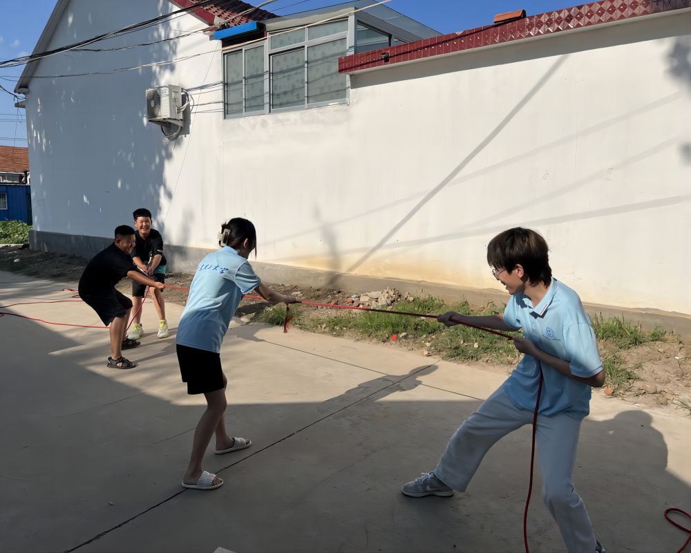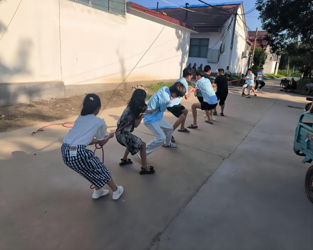 活動過程中,伴隨著實踐團成員李展鵬的一聲令下,雙方開始了激烈的拔河比賽,雙方隊員全身心地投入到比賽中,用盡全力拉扯繩索,力求將對方拖至勝利的一邊。歡呼聲、助威聲此起彼伏,現場氣氛熱烈非凡。孩子們揮灑汗水,不斷鼓舞彼此,他們通過互相激勵和默契配合,展現出令人贊嘆的團隊合作精神。支教團隊的成員們也陪伴他們進行比賽,在場上給予他們無盡的支持和鼓勵。