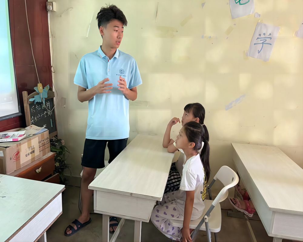 活動伊始,葛航同學介紹道“四葉草”社會實踐團一直以來致力于通過志愿服務活動改善學生的教育環境,他們深知科學教育對于孩子們的重要性,尤其是在現代社會對科技人才的需求不斷增長的背景下。因此,以生活中的化學為此次活動主題,以吸引孩子們的興趣。在化學課堂中,“四葉草”社會實踐團濰坊小組成員葛航以互動和實踐為基礎,設計了一系列有趣的實驗和活動,使孩子們能夠親身體驗和理解化學的奧妙。通過簡單的日常生活例子,如食物的烹飪、洗衣、蔬菜的生長等等,向孩子們展示了化學反應的原理和應用。同時“四葉草”社會實踐團濰坊小組成員葛航還向孩子們介紹化學在醫藥、環境保護和新材料等領域的應用,激發他們對未來科學發展的好奇心和探索欲望。