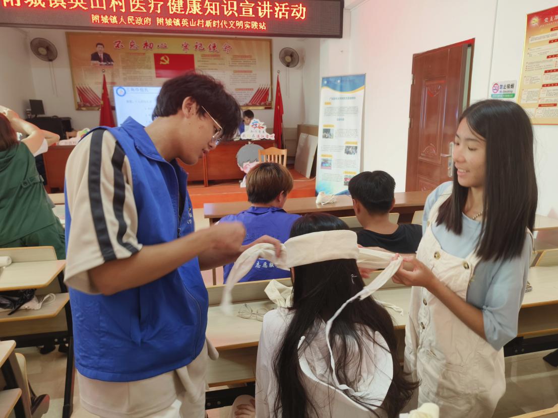 圖為急救隊隊員在英山村村委會教大學生實操三角巾包扎(黃家盈 供圖)