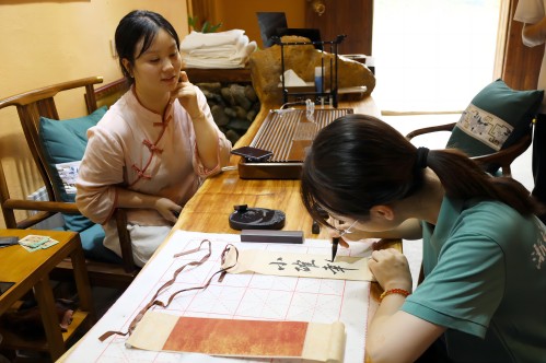 此外,實踐服務團向徐露露女士請教了有關鄉村直播的內容、技巧等問題,并在她的耐心指導下開展了“木龍榨”古法榨油非遺傳承直播。臨別時,實踐團成員為其民宿書寫下“小確幸”三字卷軸,留下財稅青年足跡。
