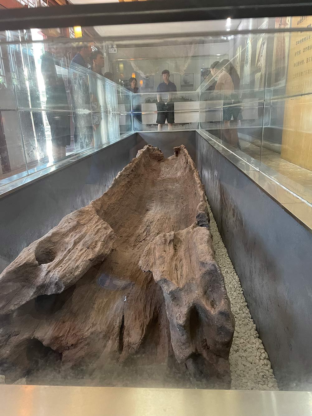 船棺驚現“主題展廳,工作人員介紹到,船棺葬是戰國至秦漢之際巴蜀地區盛行的一種喪葬習俗,因棺體形制似船而得名,一般為氏族首領和貴族使用。調研團隊了解到巴蜀先民“以船為家”的傳統,以及巴蜀先民相信人死之后,到另一個世界去生活,仍需要舟楫的信仰。