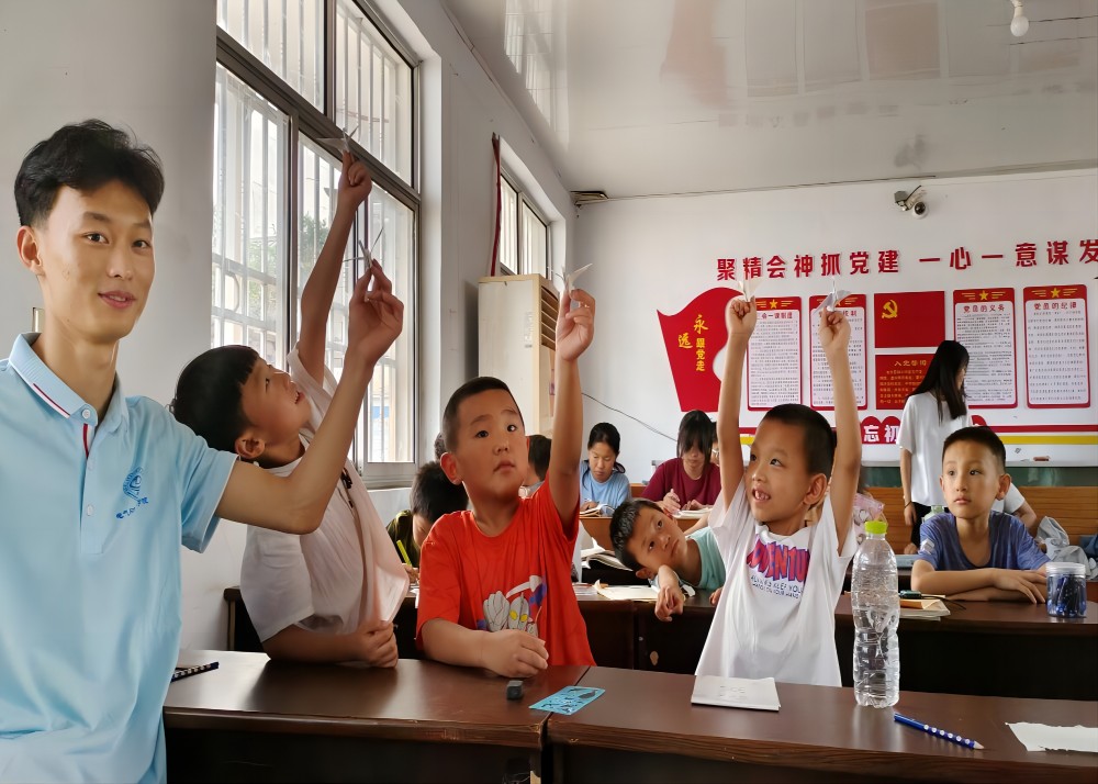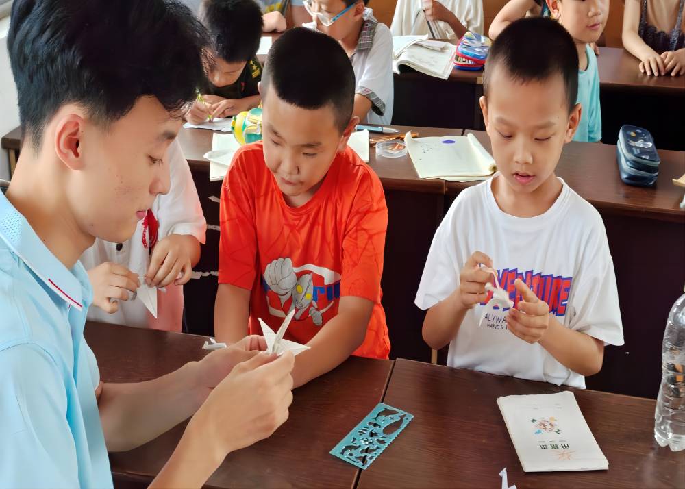 活動伊始,小隊成員引導孩子們想象鶴的特征,激發起孩子們對于折疊千紙鶴的渴望,之后,隊員耐心地教起孩子們具體步驟,在折疊過程中,孩子們細心觀察,注意力高度集中,每一步的對折,都離千紙鶴的完成更進一步,與此同時,孩子們的動手和創造能力在無形之中亦得到了極大的提升。