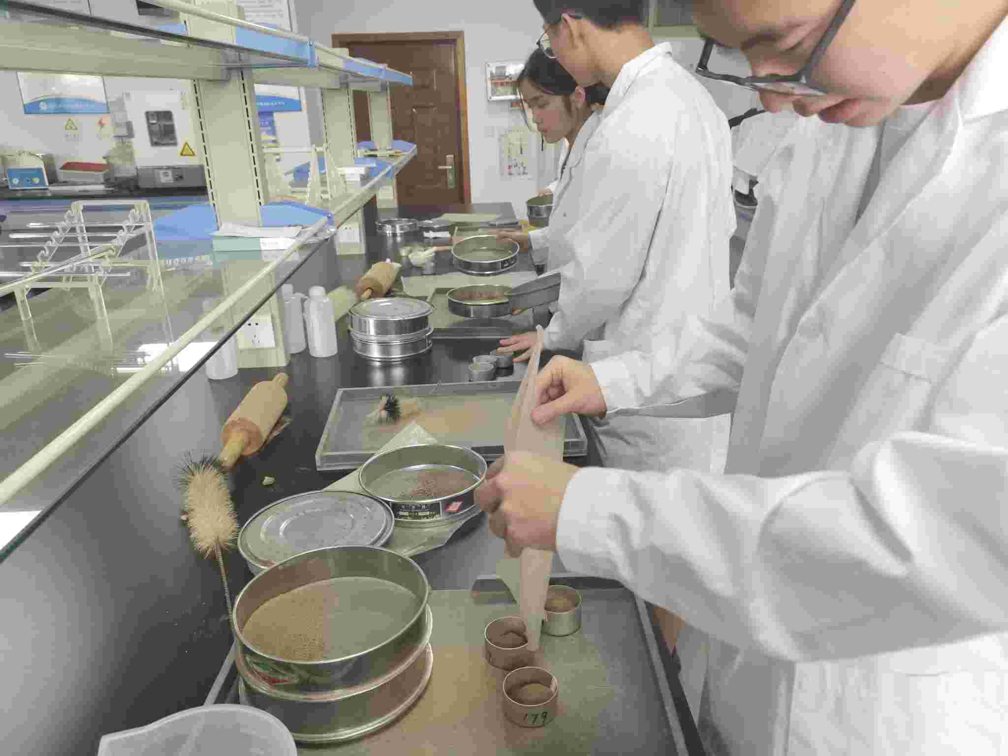 圖為隊員們正在采集樣本正值酷暑,隊員們一路汗流浹背,但通過團隊成員間的緊密協作以及之前積累的采樣經驗,順利完成了所有樣本的采集,共8個地點的24份土壤樣品。返校后,隊員們在研究生師兄的指導下將采集到的土樣進行烘干、容重測定以及研磨,得到20目和100目的土壤樣品,同時,還預先配置了相關實驗試劑。后續進行土壤酸堿度、有機質及全氮含量測定等實驗。
