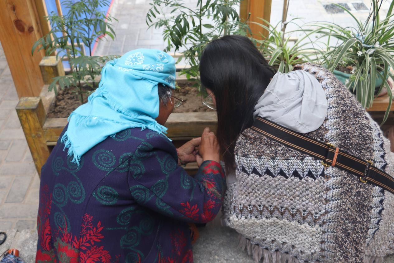 接著,實踐隊來到了盤繡園,和盤繡園的工作人員交流得知:過去的班彥村是“十年九旱,靠天吃飯”,2006年,土族盤繡被確定為國家級非物質文化遺產,但由于缺少與市場對接的渠道,沒有產品品牌的知名度,無法取得良好的經濟效益和社會效益。脫貧攻堅戰略實施后,土族盤繡憑借其獨有的民族特色,成為了班彥村民探索致富的一大門路。現在,盤繡逐漸成為班彥村的民族特色產業,形成了產業規模,帶動全村140多名婦女就業。實踐隊員從盤繡園內的老奶奶們口中得知:她們多數人都是盤繡園剛建就來工作的,不僅可以打發時間,還可以補貼生活,很開心現在繡品能在全國暢銷,向更多的人傳播土族特色文化。老奶奶們還熱情地向實踐隊員們傳授盤繡手法,鼓勵實踐隊員動手嘗試。