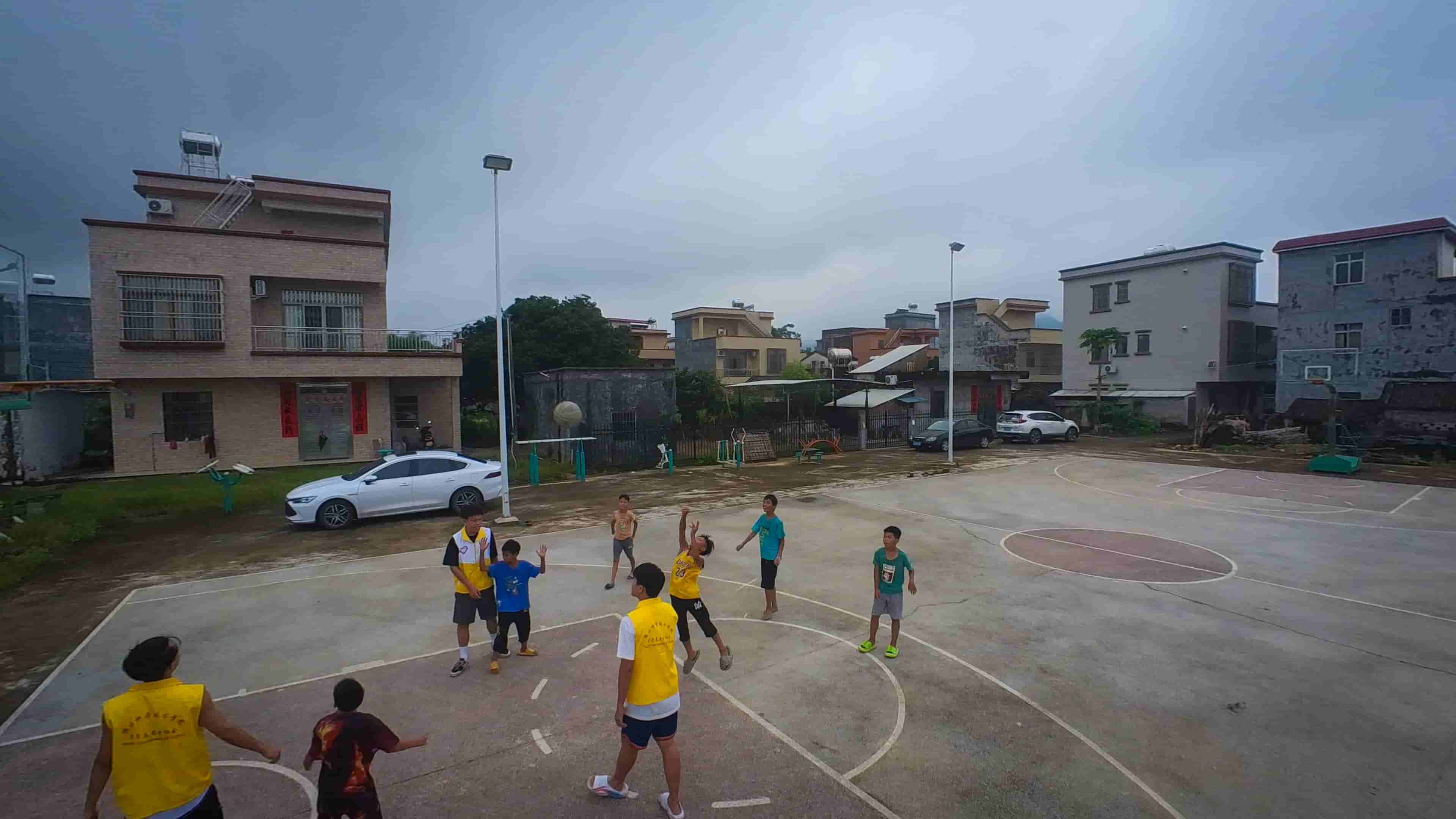 圖為“紅風古鳶”實踐隊成員與當地小孩打藍球