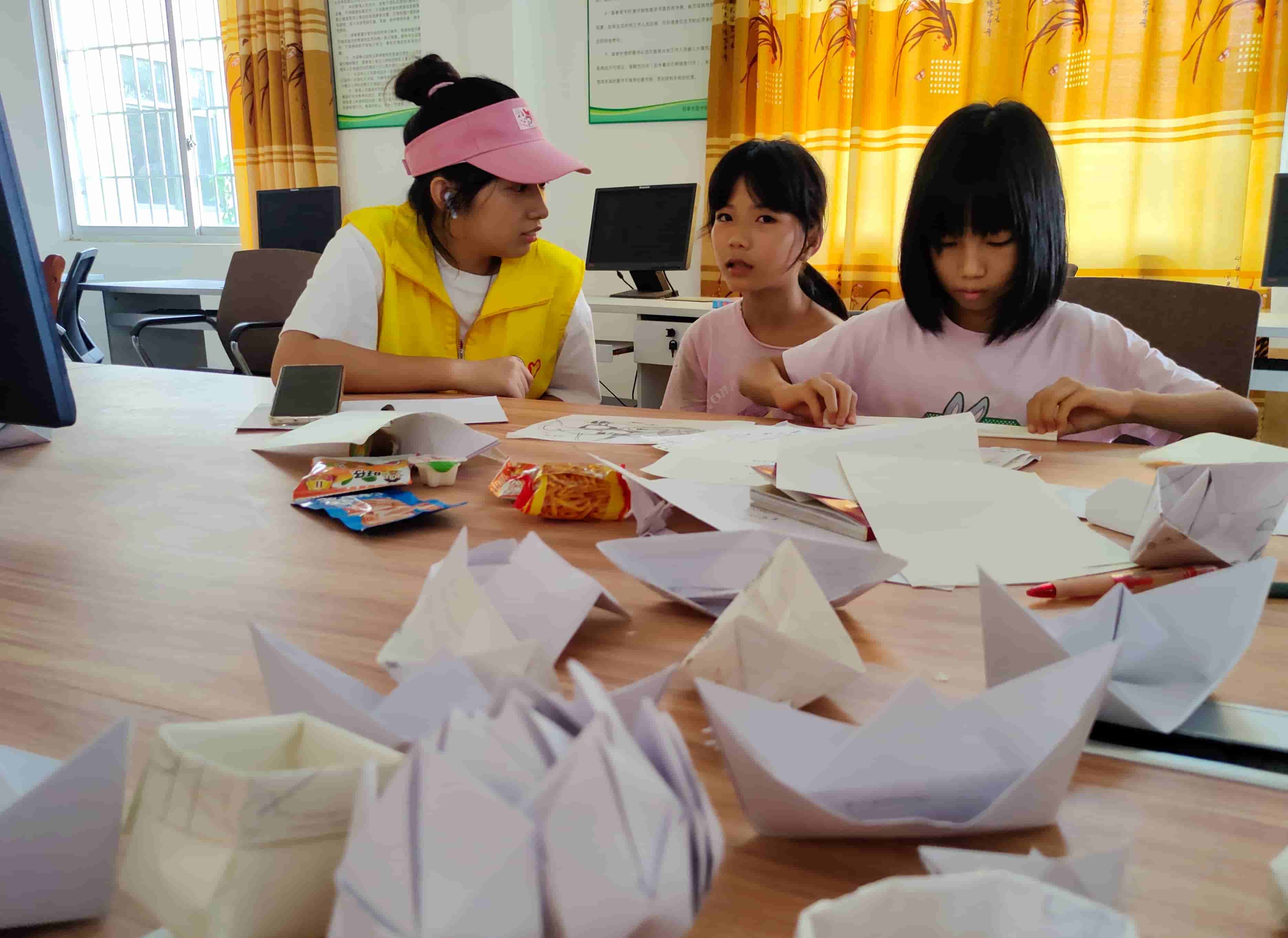 圖為“紅風古鳶”實踐隊成員與當地小孩進行折紙成船游戲