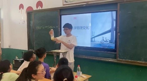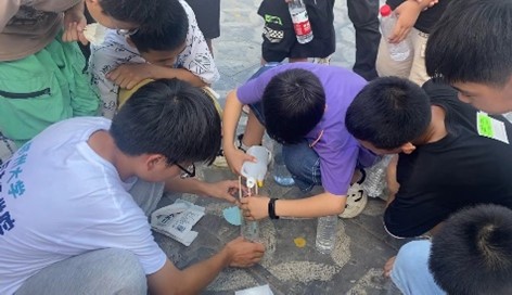 搭橋實驗結束后,老師們又帶領同學們進行了一節生動有趣的化學實驗課。課堂上老師首先講解了將要進行的化學實驗的相關原理,接著在教室內外分別演示了有趣的化學實驗。