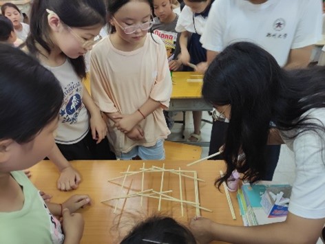 趣味實驗課堂 為了提高同學們的動手操作能力,提升同學們對科學實驗的興趣,鄭州大學薪火鼓浪支教團組織開展了搭建筷子橋趣味實驗活動。首先,老師帶領同學們一起觀賞了一些中外拱橋的圖片,激發了同學們進一步了解筷子橋的興趣。接著,老師為同學們詳細講解了搭建筷子橋原理,并耐心介紹了搭建筷子橋的步驟。同學們聽講認真,對搭筷子橋實驗充滿了興趣。
