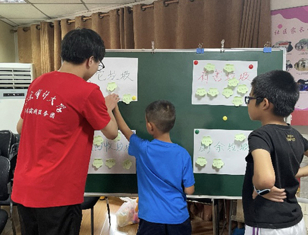 首先,團隊成員帶領(lǐng)街道的小朋友們開展“垃圾分類輕松搖”活動。團隊成員在便簽紙上寫了各種各樣的垃圾,并設(shè)立了四大垃圾分類區(qū),引導(dǎo)小朋友們了解垃圾分類的方法;顒娱_始后,小朋友們將便簽紙貼到自己認為正確的垃圾分類區(qū),貼完后再由團隊成員公布正確答案,并解釋這樣分類的原因。