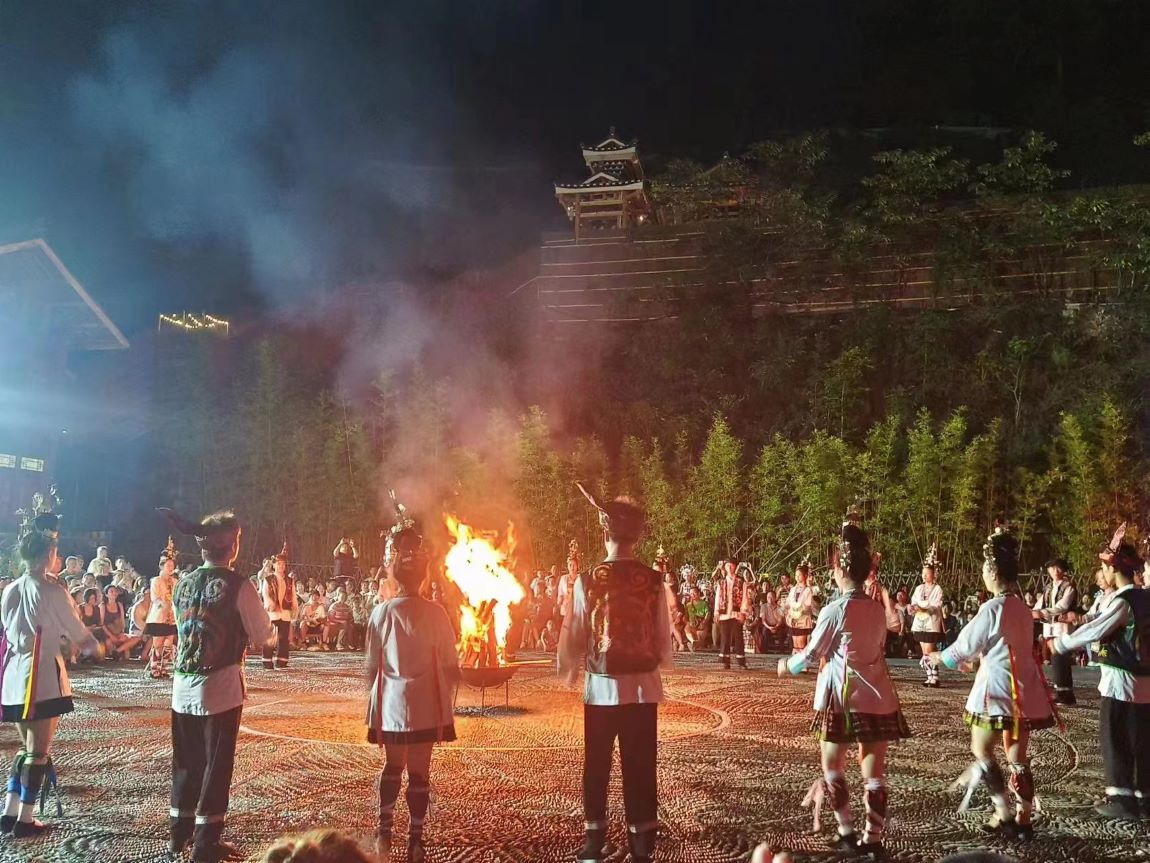 夜幕落下,侗族篝火晚會拉開序幕。晚會的開始由當地侗族大歌非遺傳承人帶領侗族男女在柴堆旁繞行三圈并三叩首后點燃篝火以祈求雨神保佑侗族人民平平安安、長命富貴。同時,篝火的點燃也意味著晚會的正式開始。之后侗族人民熱情邀請前來觀看的游客一同圍繞著篝火狂歡,體驗由侗族竹竿舞與多嘎多耶舞蹈元素相結合的特色竹竿舞。游客也由初來時的陌生感逐漸變得熟絡起來。在一片歡聲笑語中,來自不同民族、不同地域的人們其樂融融宛如一家人。伴隨著篝火的熄滅,晚會也迎來尾聲。游客們意猶未盡的合照留念,在向新認識的朋友表達對晚會的喜愛的同時熱情邀約彼此來自己的家鄉做客參觀。氛圍之和諧令陽光青年實踐隊的隊員都為之動容。侗族篝火晚會的舉行有效促進了各民族間的文化交流,對于維持民族團結的現狀起到了重要作用。