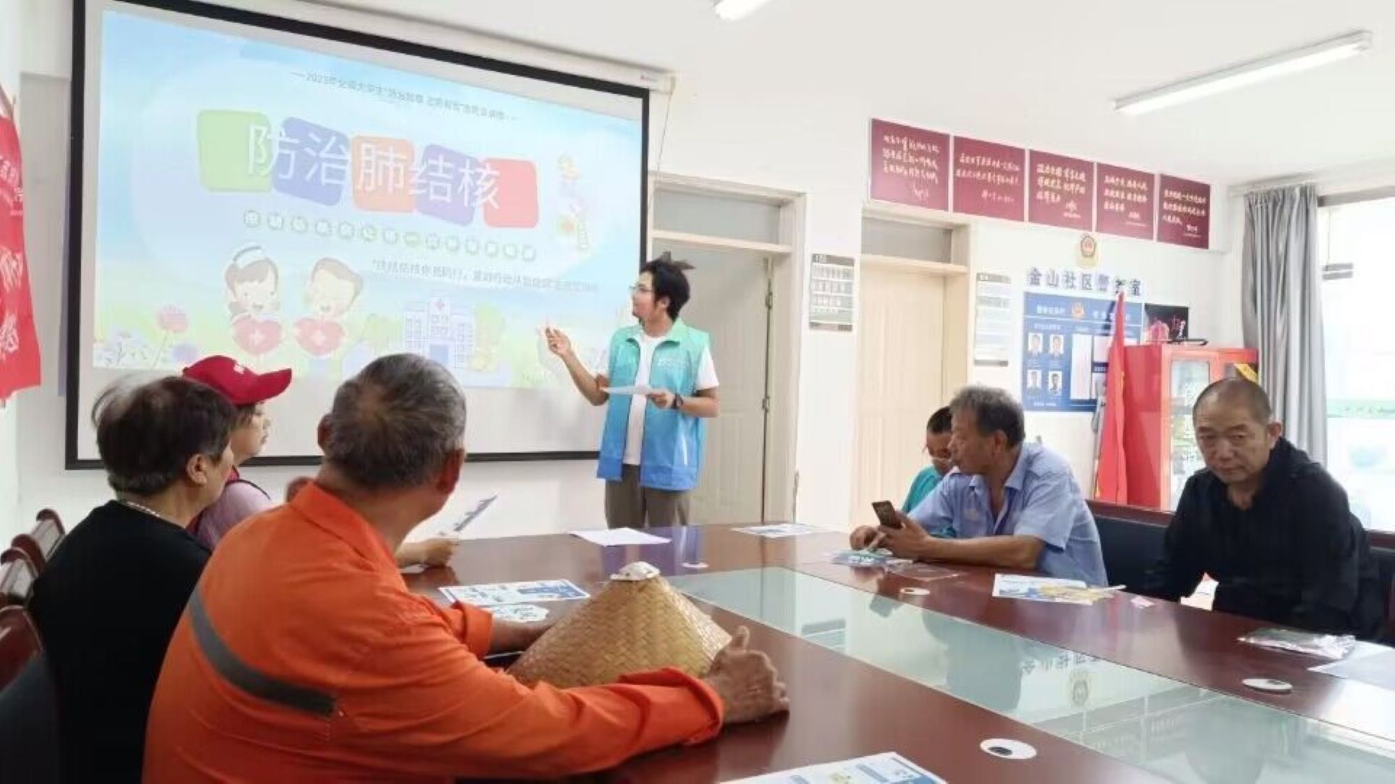 下午三時,志愿團成員首先前往金山社區(qū)進行防治結(jié)核主題宣講。本次宣講以視頻開頭,著重分析我國肺結(jié)核當今的嚴峻形勢,以危機意識激起防治意識,不能掉以輕心。在充分調(diào)動居民對結(jié)核的思考后,志愿者正式介紹什么是肺結(jié)核。隨后,通過各種生動的圖片視頻以及耳熟能詳?shù)睦樱驹刚呱钊霚\出地介紹了防治肺結(jié)核相關(guān)常識,詳細闡明了結(jié)核病的危害性、傳播途徑、易感人群和怎樣科學有效的防治肺結(jié)核。在宣講的最后,志愿者們呼吁社區(qū)居民,不僅要做自己健康的第一責任人,規(guī)律生活、戒煙限酒,夏季常通風,也應將知識傳遞給身邊的親人和朋友,攜手共同抵御結(jié)核病的侵害,做到未雨綢繆、防患于未然。