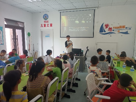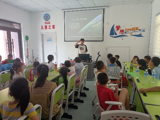 宇宙浩瀚無垠,令人向往,在和同學們交流的過程中,支教隊員們發現許多同學對地球在宇宙的位置,各個星系有濃厚的興趣。為此,在8月2日第二節課,曾一豪老師特別設計了“宇宙中的地球”這一特色課程,從地球到太陽系再到銀河系,再到宏大的宇宙,一張張夢幻深邃的照片引來了同學們的陣陣驚嘆,最后,曾一豪落腳地球在宇宙中的獨特性以及地球生命的來之不易,呼吁同學們保護好自己的唯一家園。