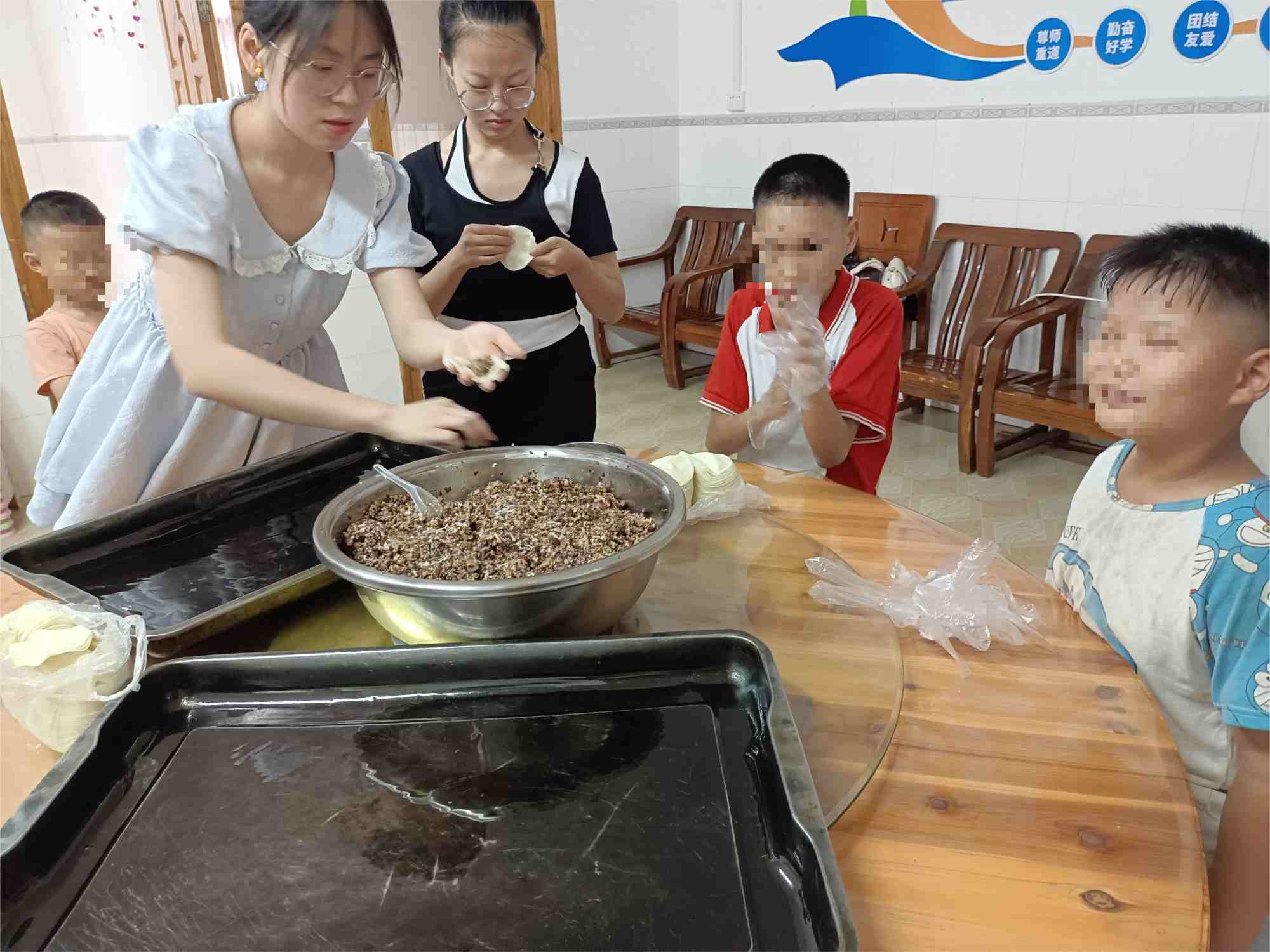 除了繪本閱讀的指導,志愿者們和福利院兒童們一起動手包餃子,讓孩子們體會到家的溫暖,也引導孩子們學會基本的生活技能,培養孩子們的動手能力。