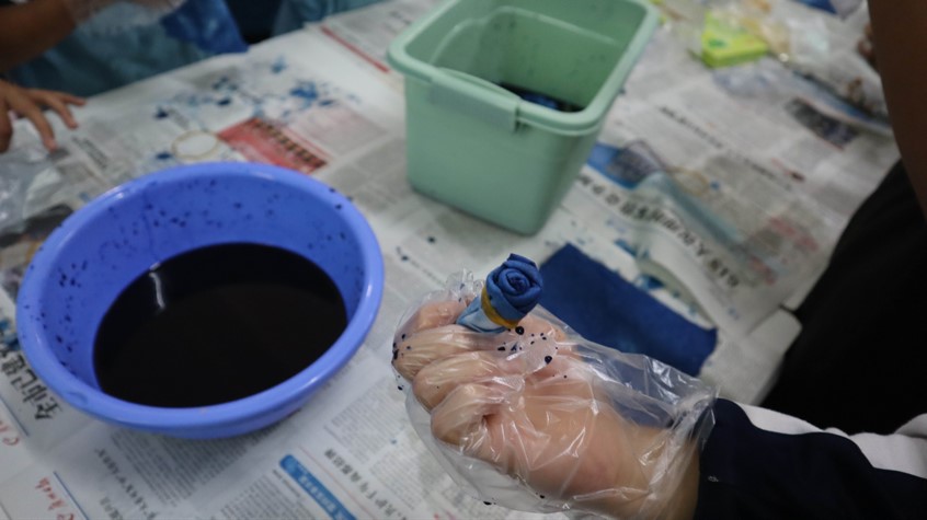 在實踐隊隊員的耐心引導和鼓勵下,孩子們逐漸掌握了扎染的扎結技巧和染色的注意事項,開始了最期待的環節——動手操作,染料和小方巾會碰撞出什么樣的火花呢?孩子們先將白色的小方布按照自己喜歡的方式折好、扎好,有的還在白布上繪制出了自己喜歡的圖案,接著將染液按照自己的心意浸潤在白布上扎染,感受扎染獨特的神秘性,孩子們嘗試不同的扎法和染法,樂此不疲,現場歡聲笑語一片。
