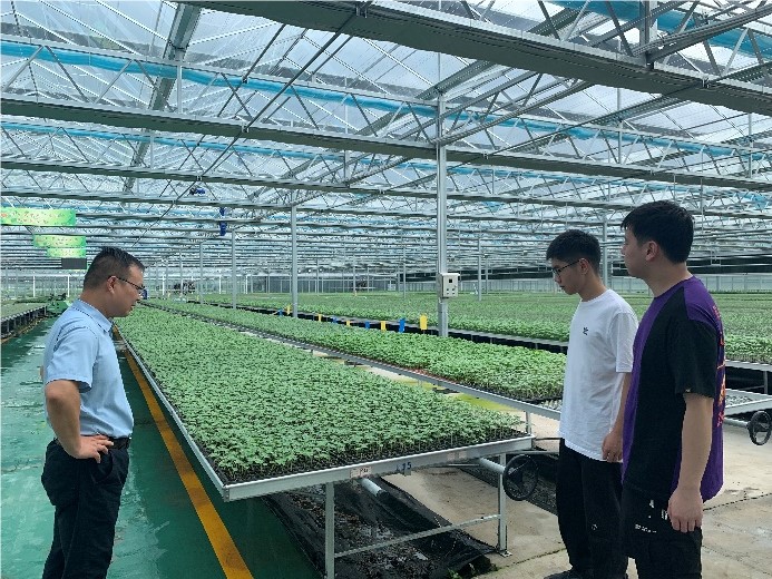 在走訪梨園之后,團隊來到了苗樂科技有限公司。在這里,團隊成員了解了濱海現代農業產業園區規劃,觀看學習重點項目規劃區域圖,深入認識園區發展布局。隨后,走進大棚智能化育苗工廠,該基地年均培育各類種苗1.5億株,其中的七成為本地訂單。育苗具有苗壯、抗病性好的優點,服務于周邊各個縣區,助力周邊農戶增收。