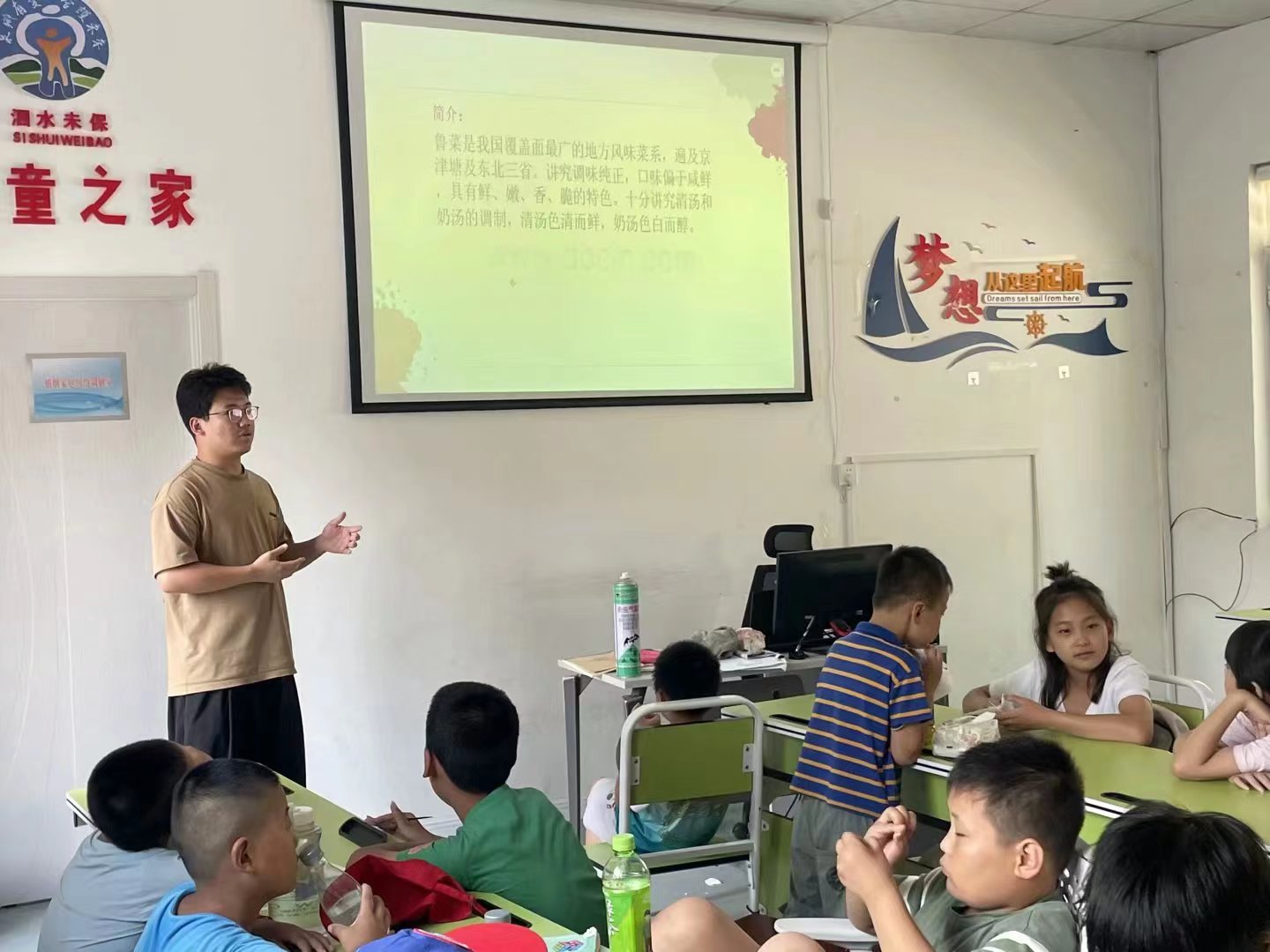 民以食為天,飲食文化是最貼合民生的文化。魯菜作為八大菜系之首,在中國的飲食文化中有著非常重要的地位。因此,支教隊員李翼在8月8日下午為同學(xué)們帶來了“魯菜”課程,他首先播放了《舌尖上的中國》中魯菜的混剪片段,引出主題——魯菜,又從魯菜歷史、主要菜品、技藝以及風(fēng)味特色四個角度和同學(xué)們一起了解了魯菜,并通過圖片問答,搶答,有獎競猜等形式,保證每位同學(xué)都能夠真正了解本節(jié)課的內(nèi)容。