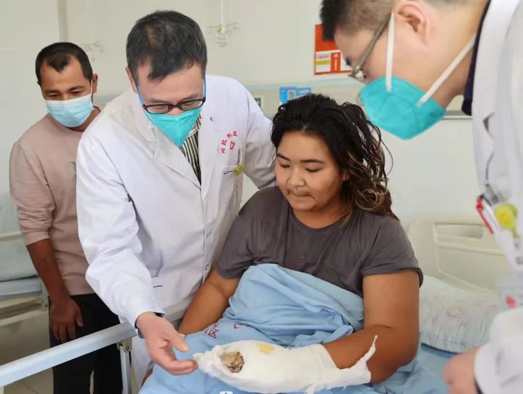 據了解,吻合血管游離多葉瓣移植屬于皮瓣手術中高精尖的技術,需要在顯微鏡下操作,且操作極其精細復雜,要求醫生除具有精湛的顯微外科吻合技術外,同時要具備強大的耐力和高超的審美設計能力。面對一系列挑戰,“身經百戰”的張文正做好充分準備。在吉某各項指標穩定后,張文正帶著阿拉爾醫院骨科高喜成、張曉銳醫生成功實施了游離皮瓣移植術。