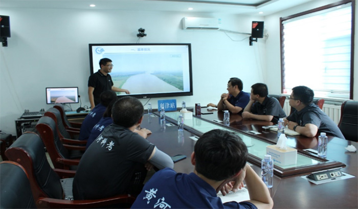 實踐活動的第三站是山東利津水文站。利津水文站位于山東省東營市利津縣利津街道劉家夾河村,東經118°18',北緯37°31',是黃河上最下游的一個水文站,黃河入海的控制站。水文站測驗項目主要有水位、流量、含沙量、泥沙顆粒級配、水溫、氣溫冰情、水質等。座談會上,科考隊員與利津水文站的工作人員就水文監測和數據分析等方面進行了深入交流。隨后,科考隊員參觀了利津水文站的實際工作現場。通過實地考察,隊員們深入了解了水文站的設備和技術應用情況,對水情數據的收集、傳輸和處理過程有了更直觀的認識。