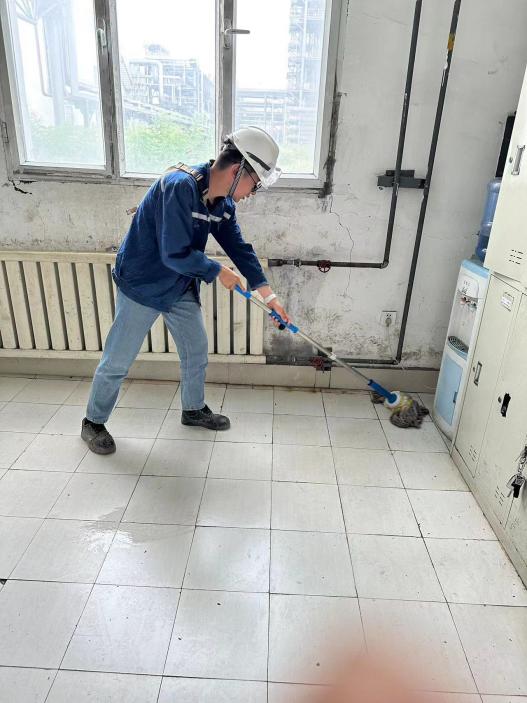 圖為王剛利用閑暇時間在單位做清潔的場景