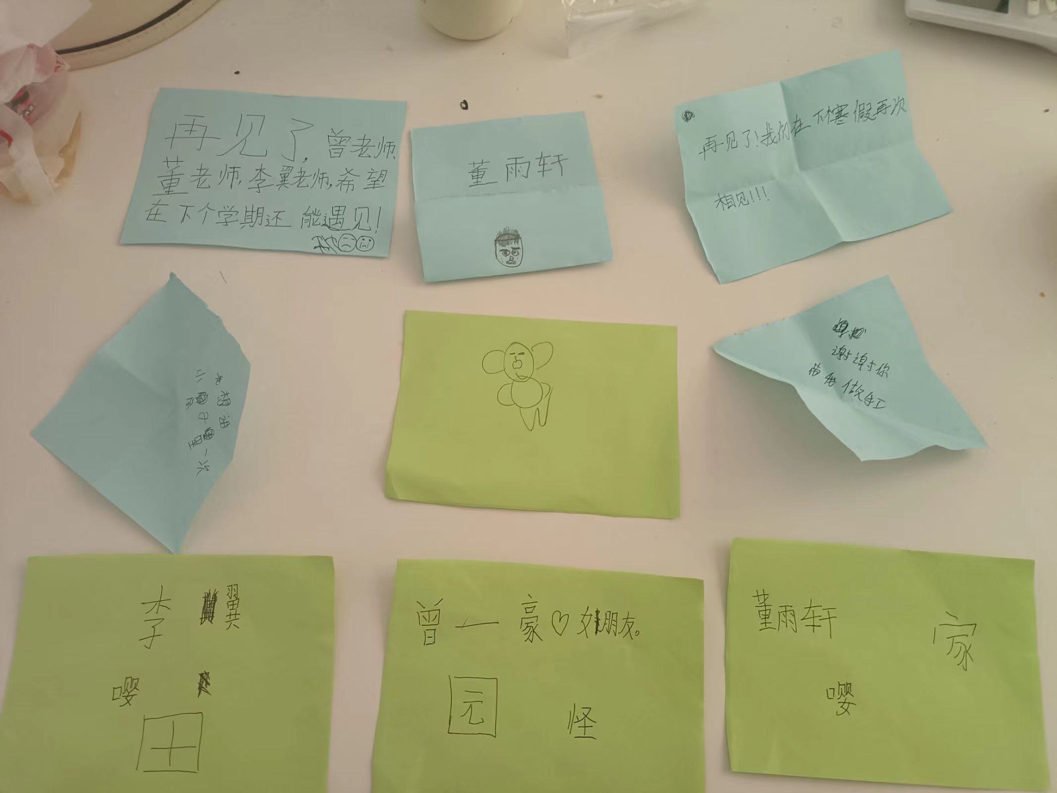 不知不覺已是和孩子們的最后一堂課,頒發(fā)下昨日趣味運動會的獎品后,各位支教老師一起為孩子們上了一堂班會,與孩子們做最后的告別。孩子們與老師互相寫下了激勵的話語,有的感謝老師們辛勤付出,有的為老師送上祝福,更有的為老師們畫上自己用心的畫像,氛圍分外融洽,似乎一定程度上掩蓋了離別的悲傷。但為期兩周的支教活動一定為孩子們也是為支教隊員們有了深刻的印象,并有了不小的收獲。至此,在泗水東仲都村的支教活動圓滿結(jié)束。