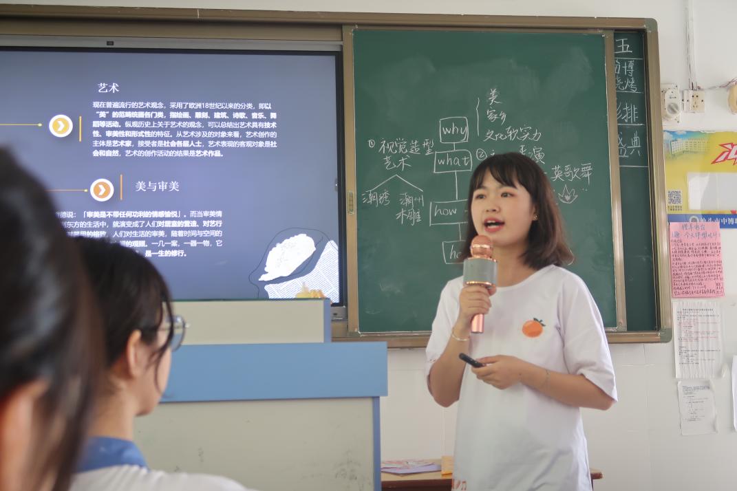 “探尋潮汕的多彩藝術(shù)世界”課程由隊員葉思爍主講。課程從“為美、為家鄉(xiāng)、為文化軟實力”三個方面告訴同學們了解潮汕藝術(shù)的重要性;接著,以“一件晚禮服、一處寺廟、一場勞熱”為引,分“潮汕視覺造型藝術(shù)”和“潮汕視聽表演藝術(shù)”兩大板塊帶領同學們輕叩潮汕藝術(shù)之門。同時,本課程還設置了“潮汕地區(qū)的植被”和“潮汕人口遷移”兩個地理板塊,讓同學們在接受藝術(shù)熏陶的同時,增進對本地區(qū)歷史地理環(huán)境的認識。