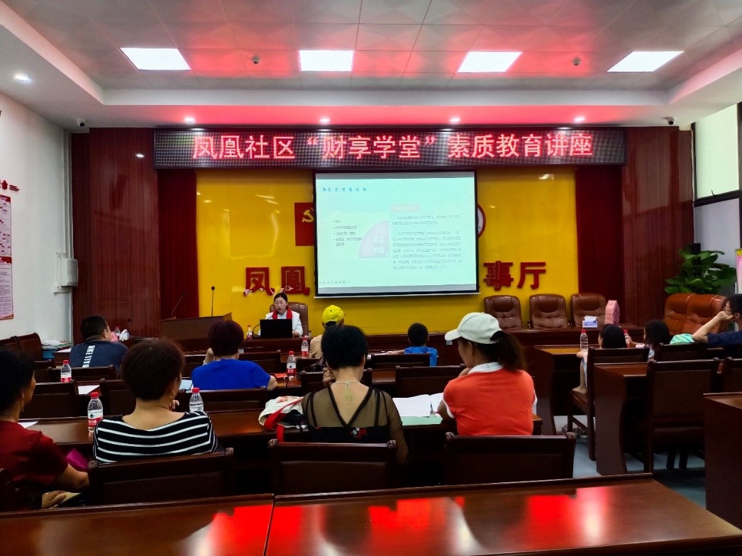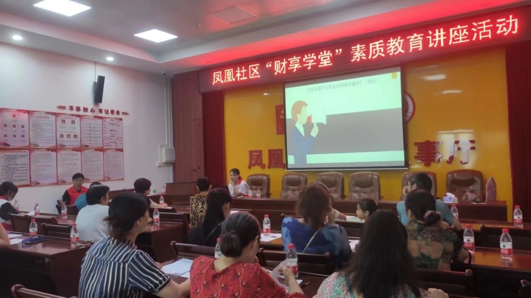 7月20日上午,“財享學堂”素質教育公益課堂在鳳凰社區居民委員會會議室正式啟動,面向鳳凰社區居民開展了為期兩天的培訓。本次公益課堂以“提高居民財經素養,謹防金融詐騙”為主題,從防詐與反詐、貨幣與利率、儲蓄與信貸、投資與收益這四個課題向社區居民進行財經知識科普。