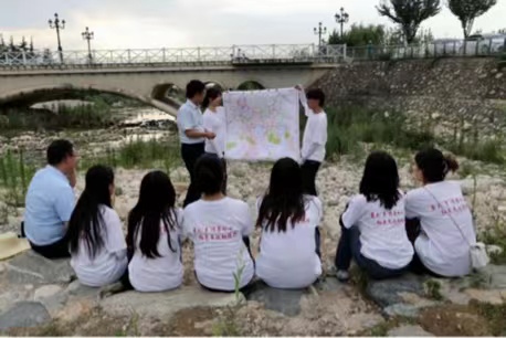 圖為郎老師利用地圖為實踐隊員講解環境治理知識
