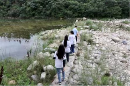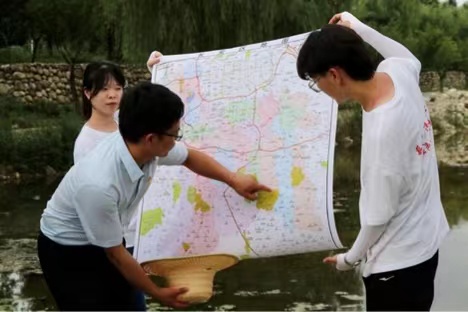 在大峪新村的稻田河邊,社會實踐隊帶隊老師朗亮明為實踐隊成員講述了一堂稻田里的思政課。郎老師利用地圖生動詳細地講解了大峪新村所利用的物種間資源互補的循環農業生態學機理,“種養結合、綠色生態”的特色生產模式。稻漁共生、以漁促稻,依托水稻和水產兩大資源優勢、基于物種間資源互補,在促進水稻增產、提高農民總體收入的同時也能夠提升稻田環境質量、促進土地生態恢復。