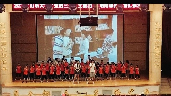 接著,由支教老師們共同上臺演唱歌曲《稻香》。十幾天的支教時光讓每位志愿者都對這個淳樸社區的孩子們產生了深厚情感,悠揚的音樂在影劇院內飄蕩,傳遞出志愿者與孩子們共勉,珍惜光陰,懷揣夢想,奮發向上的美好祝福。