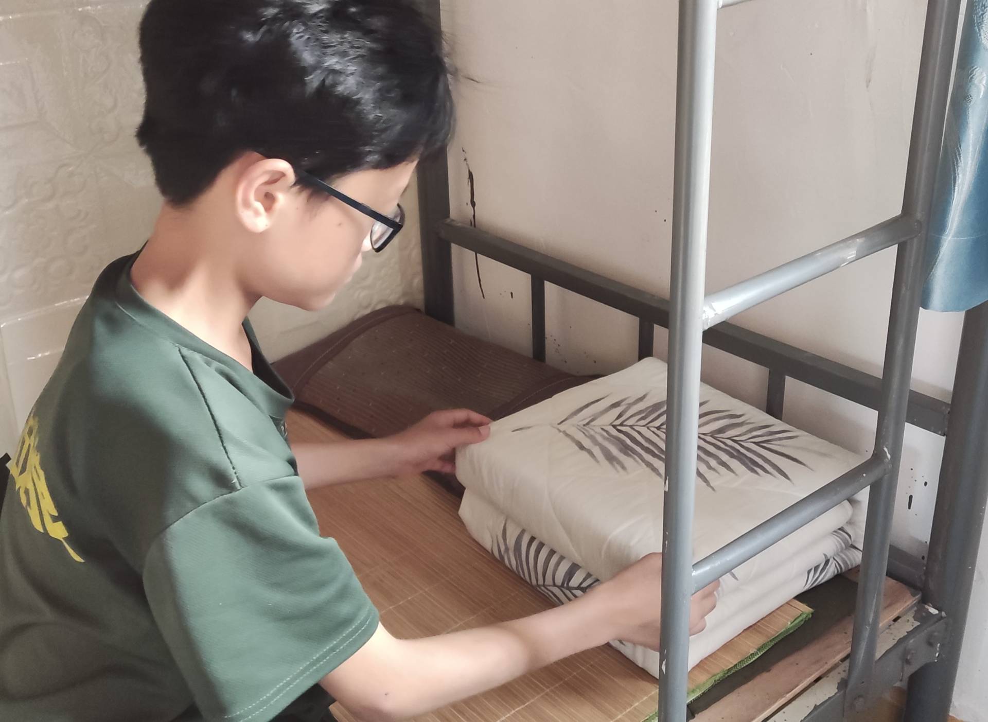 圖為夏令營的孩子在整理內(nèi)務(wù)