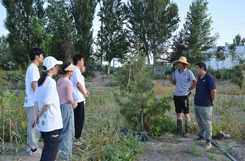 隨后,實踐團來到特色林果示范基地。目前基地引進軟籽獼猴桃、松樹“黑松-250”、李子、黃金蘋果、紫玫瑰等品種種植。其中,142團的“黑松-250”作為新品種尚屬全疆首次引入。目前基地里成型的黑松-250尚處于幼苗培育期。實踐團成員們發現,為了保護幼苗,農戶們采用在行間的水管打孔,用細小的水柱噴灌的方式澆水。農戶介紹道,松子的經濟價值很高,而常見的東北野生松樹結籽一般需要生長50年,基地里成型的松樹可以用紅松或油松嫁接,縮短生長期,極大程度提高了經濟效益。10月至11月松子成熟后進行加工,之后便可上市銷售,也就是市面上的“開口松子”。嫁接育種成為新種引進與良種育種的新思路。