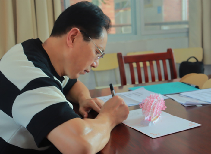 圖為廬江中學(xué)正高級教師孫家來為團隊寫寄語 多彩大學(xué)生網(wǎng)通訊員 梁豫琪 攝