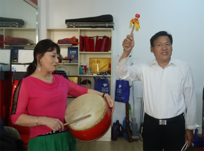 徐團長與朱女士得知隊員此行的目的,欣然接受了隊員們的采訪。在談到方言保護的重要性時,徐館長指出:方言與許多文化的傳承都息息相關(guān),比如廬江特有的廬劇、門歌等文化遺產(chǎn)都是依托方言而存在,方言一旦遺失,廬劇傳承乃至戲曲都會面臨困境,出現(xiàn)年輕人聽不懂、不愛聽的情況。在小組隊員高思佳的提議下,徐團長與朱女士一起表演了廬劇門歌《大美廬江我的家》的片段,響亮的銅鑼聲與規(guī)律的敲鼓聲讓隊員們仿若來到了正式表演的現(xiàn)場,即使二位沒有穿上戲服,卻依舊顧盼神飛,神采飛揚。