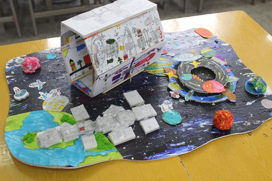 展覽現場,教室里布置得異常精致。每個小組的作品都有著自己獨特的主題和風格,彰顯著孩子們的創意與想象力。海洋,宇宙,未來,云南梯田……每幅畫作、每個手工作品都記錄著孩子們對于理想家園的向往與暢想。整個展覽空間彌漫著孩子們的歡聲笑語和對未來美好生活的期盼。