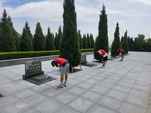 實踐隊事先與烈士陵園管理中心聯系,進行預約烈掃陵園活動,烈士墓區安葬著1197名烈士,墓區以甬道為中線,花崗巖墓分置兩側,梯次有序,列隊如伍,莊嚴肅穆,實踐隊隊員們首先敬獻花圈表示對革命先輩的敬重,然后集體默哀三分鐘。在陵園的組織下,重圍入黨誓詞,最后繞園一周,集體向烈士三鞠躬。