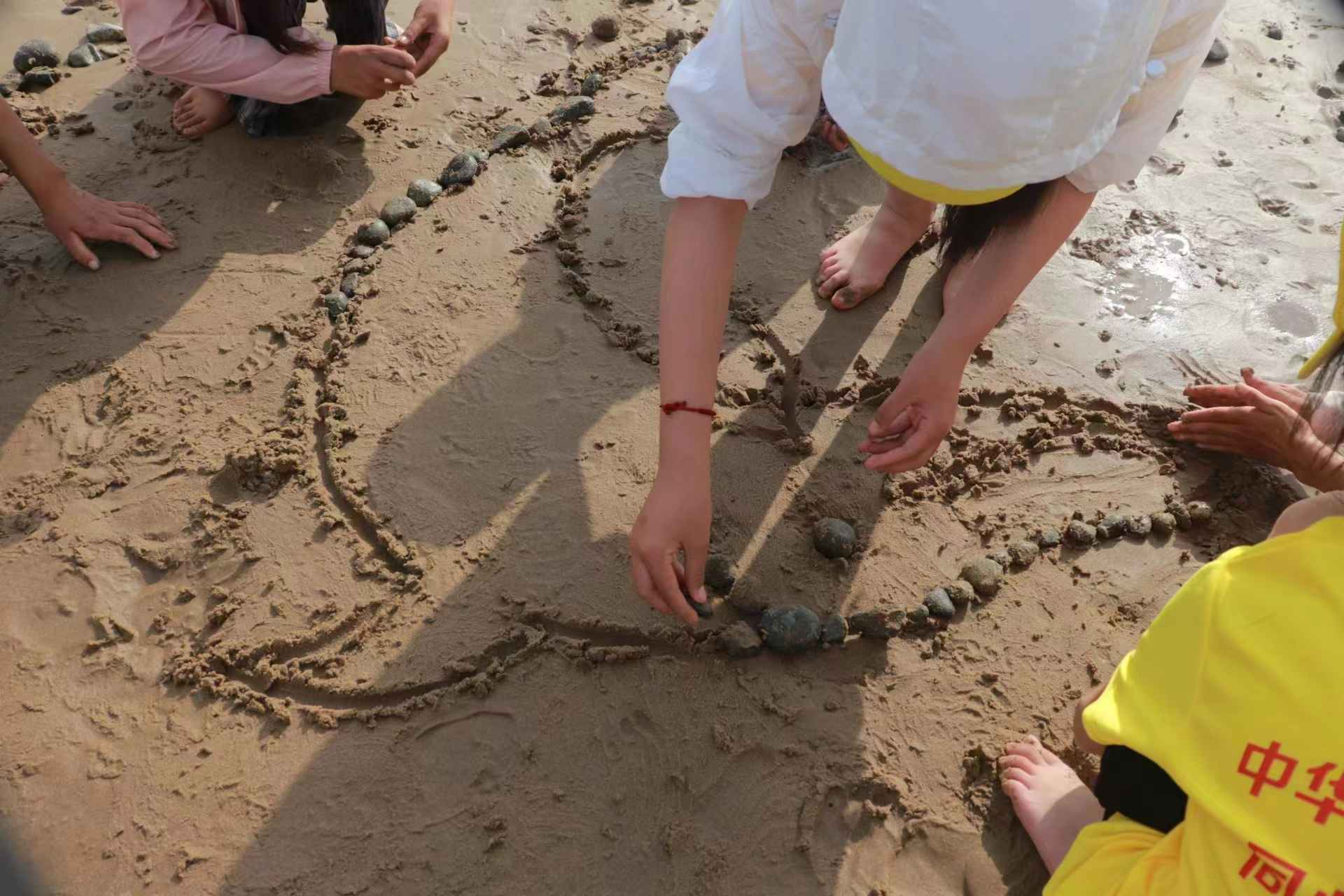 在朱家尖情人島上的露營初體驗,小朋友們非常興奮和激動。早晨簡單的集合整裝后,孩子們與團隊成員出發前往東沙海灘與烏石塘。一望無際的大海,拍打著海岸,低吟著或低或高的歌聲。沙灘上,石頭被小朋友們賦予不同的靈魂,擺出的石頭畫栩栩如生。到達烏石塘,在這個由無數的黑灰色鵝軟石鋪陳的小海灘上,小朋友們拾起自己喜歡許愿石,雙手合十將許愿石放在手心,面朝著大海,許下自己心底的愿望。