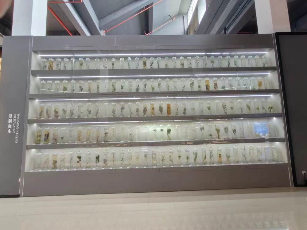 繼續上一層,走進中藥標本陳列館,通過位于成員們左手邊的兩臺液晶顯示器,可以觀看海洋藥用資源多媒體展示,也可以參與答題,三樓共有十三個展區,陳列著各式各樣的動植物和礦石中藥標本,第二展區的四個展柜則分別陳列著一些道地藥材的規格等級和真偽對照,第三展區是中藥命名方法標本展示區,第五展區陳列著全國中藥材道地產區分布圖和標本,其余展區是中成藥展區等等。走出標本館,步入與之相鄰的校史陳列館這里有詳盡的文字和照片,展示上海中醫藥大學1956年建校以來的發展歷程。