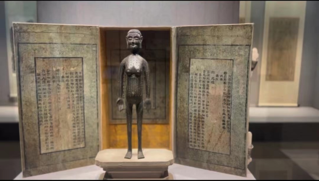 隨著探索的深入,成員們來到針灸館,可以看到二層中間位置展出的上海中醫藥博物館的鎮館之寶----1744年鑄造的老婦人形象的針灸銅人。這具銅人高46厘米,寬22.8厘米,厚16厘米,為老婦人形象,體態豐腴自然,面部表情慈祥生動。歷史上針灸銅人的形象一般為男子,老婦人形象極為少見,且體表鑄有經絡穴位,但未鑄經穴名,現國內僅見此一件,十分珍貴。據文字記載,乾隆皇帝為了嘉獎編纂綜合醫學叢書--《醫宗金鑒》的編著人員,定制了一批針灸銅人,如今國內僅存此一件帶錦盒的完整器具。這具針灸銅人是傳世針灸銅人之中難得一見的老婦人的體態,高約46厘米,面容慈祥,體表刻有580個穴位,錦盒上印有皇帝玉璽,題跋上用漢滿文注明了銅人頒發給《醫宗金鑒》的謄寫官福海。上海中醫藥博物館的展宣部館員陳侶華曾說過這一套醫書整體有90卷,里面不僅僅包括針灸學的內容,涉及了內外婦兒疑難雜癥方方面面,但他單單取針灸銅人這個形象,作為獎品獎勵給這些醫官,這足以反映針灸銅人的醫學價值所在