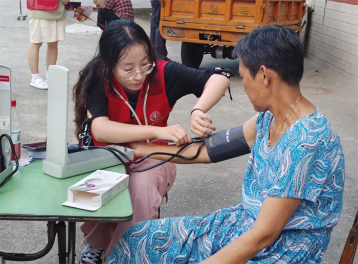 圖為實踐隊員為當地居民測量血壓 多彩大學生網通訊員 張露露 攝
