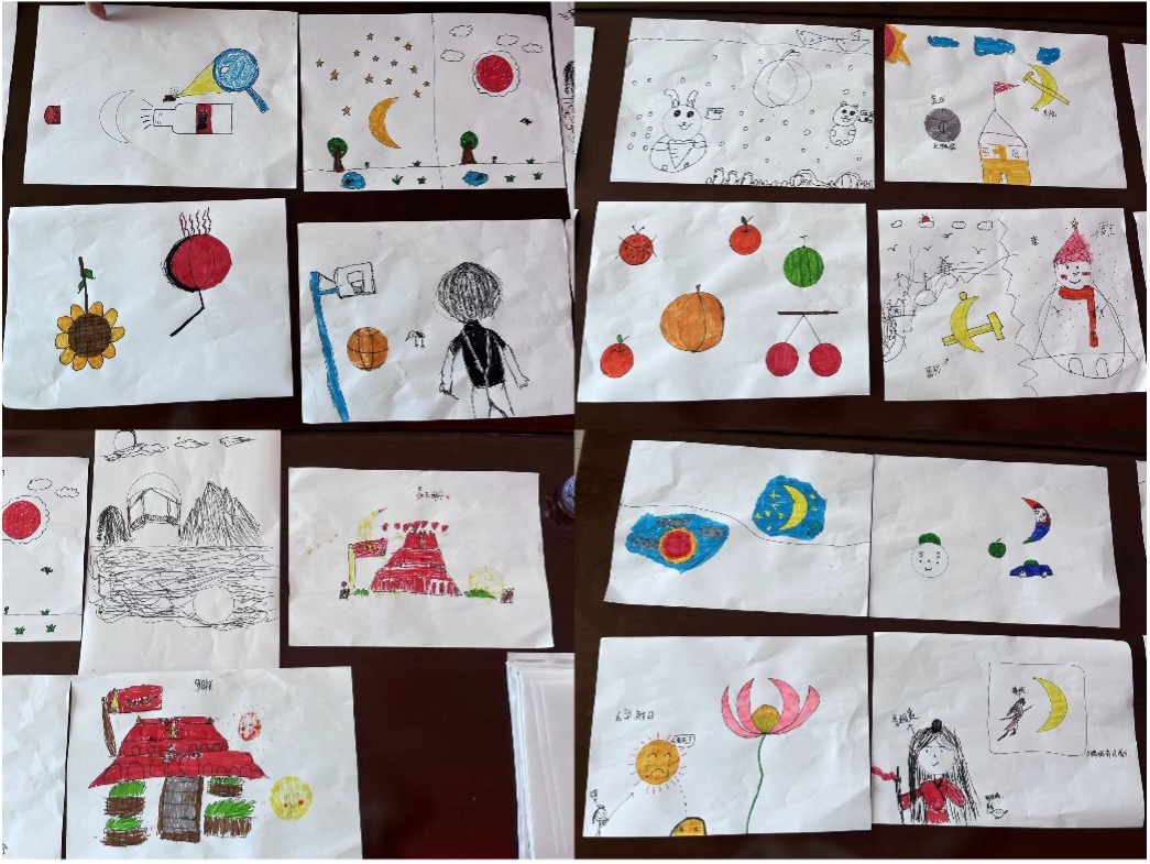 課堂中,隊員讓孩子們以一張印有圓圈和月牙圖案的紙為初始狀態(tài)進行創(chuàng)作,任憑孩子們發(fā)揮他們無邊的想象力在紙上繪出自己的想法。孩子們創(chuàng)作得很快,不到半小時就上交了畫作,而作品內(nèi)容之精彩讓隊員們連連驚嘆。隊員們表示在第一眼看到圖案時只能想到聯(lián)想到太陽和月亮,而孩子們卻把“月亮”看作荷花花瓣,看作共產(chǎn)黨黨徽的鐮刀,看作橘子的一瓣,看作沖擊波;把“太陽”看作放大鏡,看作人頭,看作兔子,看作水中圓月的倒影