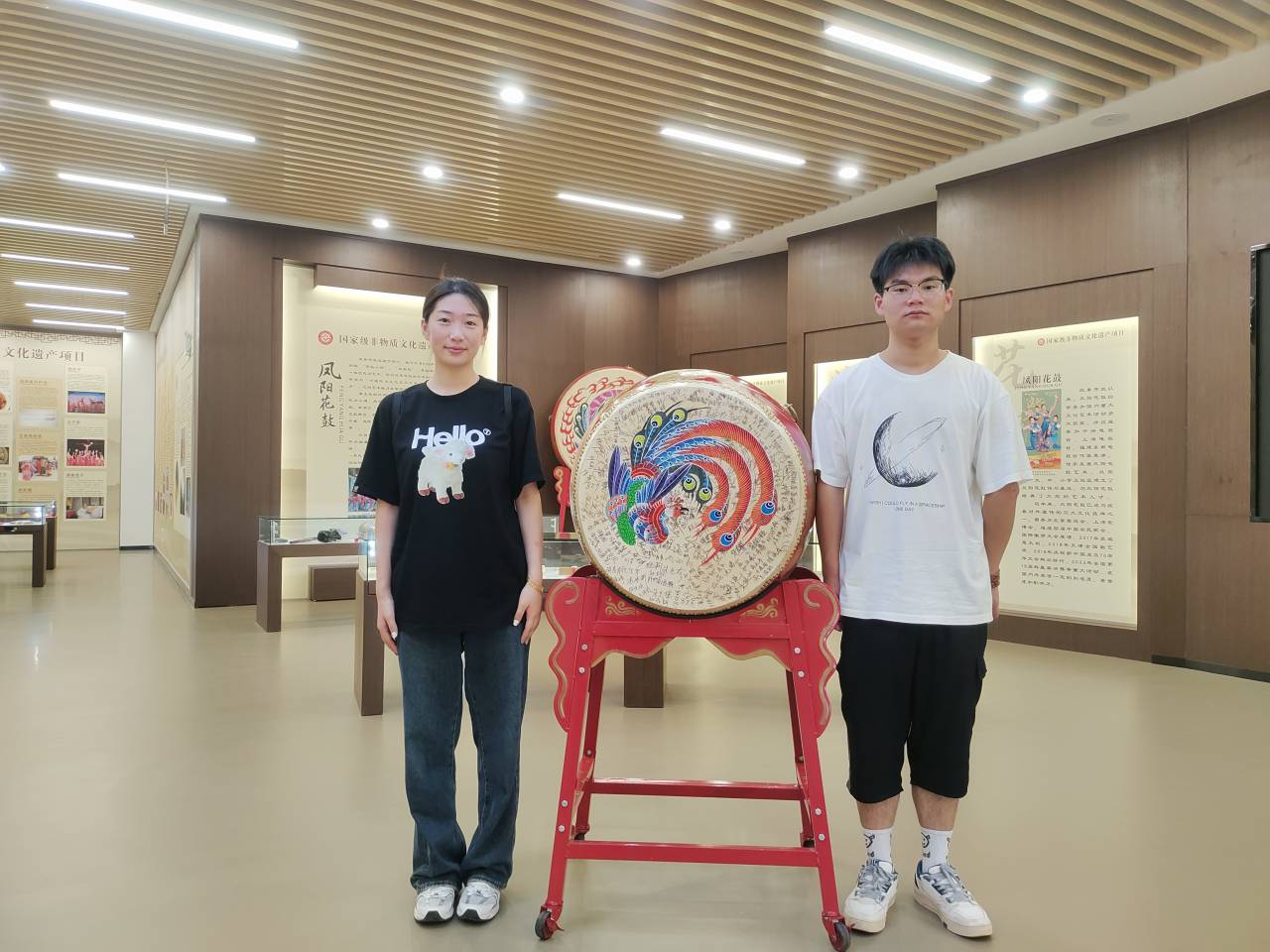 團隊隊長方家巖是安徽鳳陽人,8月21日下午,他帶領隊員參觀了鳳陽文化館,在隊長方家巖的介紹下,隊員對鳳陽花鼓有了進一步的了解。隨后,團隊采訪了鳳陽花鼓省級代表性傳承人肖慶紅老師。采訪中,肖慶紅老師主要講述了她在繼承、發揚與創新鳳陽花鼓文化的經歷,她對鳳陽花鼓走出國門,面向世界感到非常自豪。肖慶紅老師現場還進行了一段《鳳陽歌》的花鼓表演教學,并介紹了擊鼓過程中的要點以及學習花鼓的難點。