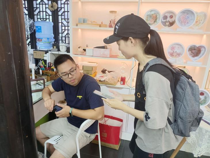 7月30日,團(tuán)隊(duì)成員前往南京高淳老街展開(kāi)實(shí)地調(diào)研。南京小組選擇該街區(qū)人流量較大的景點(diǎn),與游客、商家、文化工作者以及老街的原住民進(jìn)行訪談交流,共同探討高淳老街特色文化開(kāi)發(fā)現(xiàn)狀。