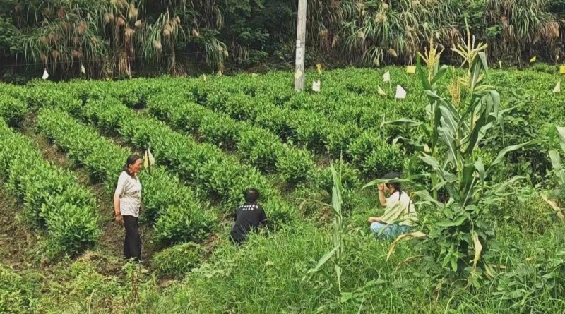 圖為實踐隊伍成員在采訪為茶葉鋤雜草的茶農們